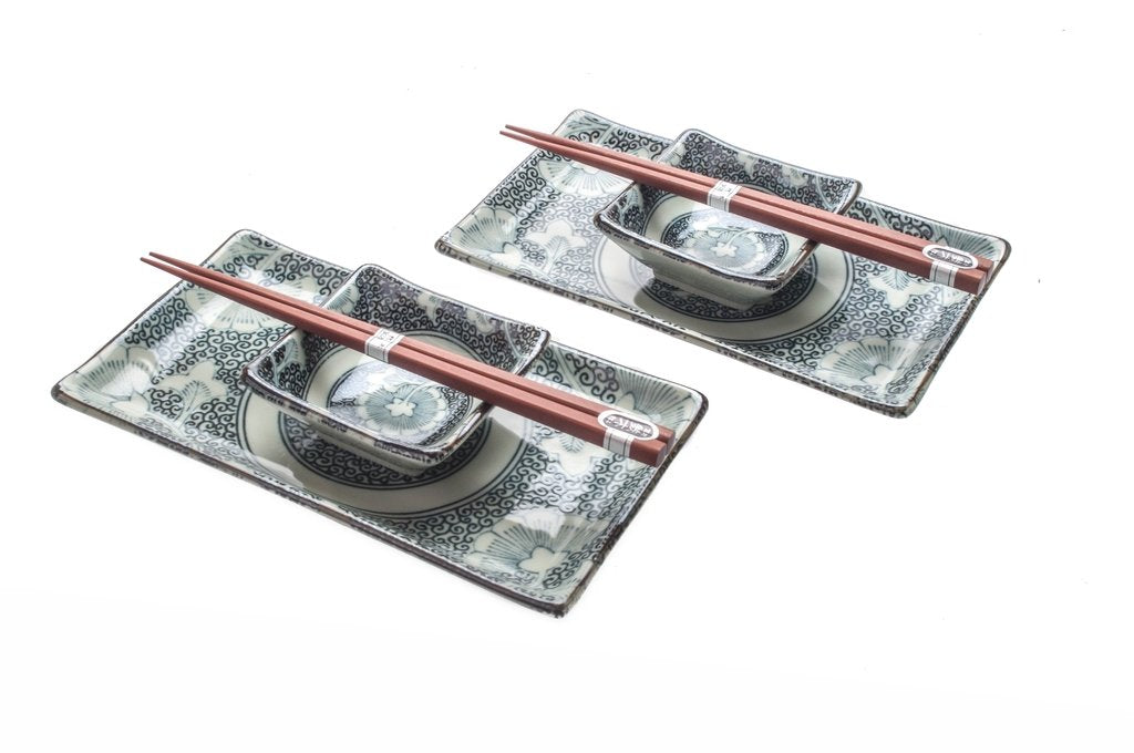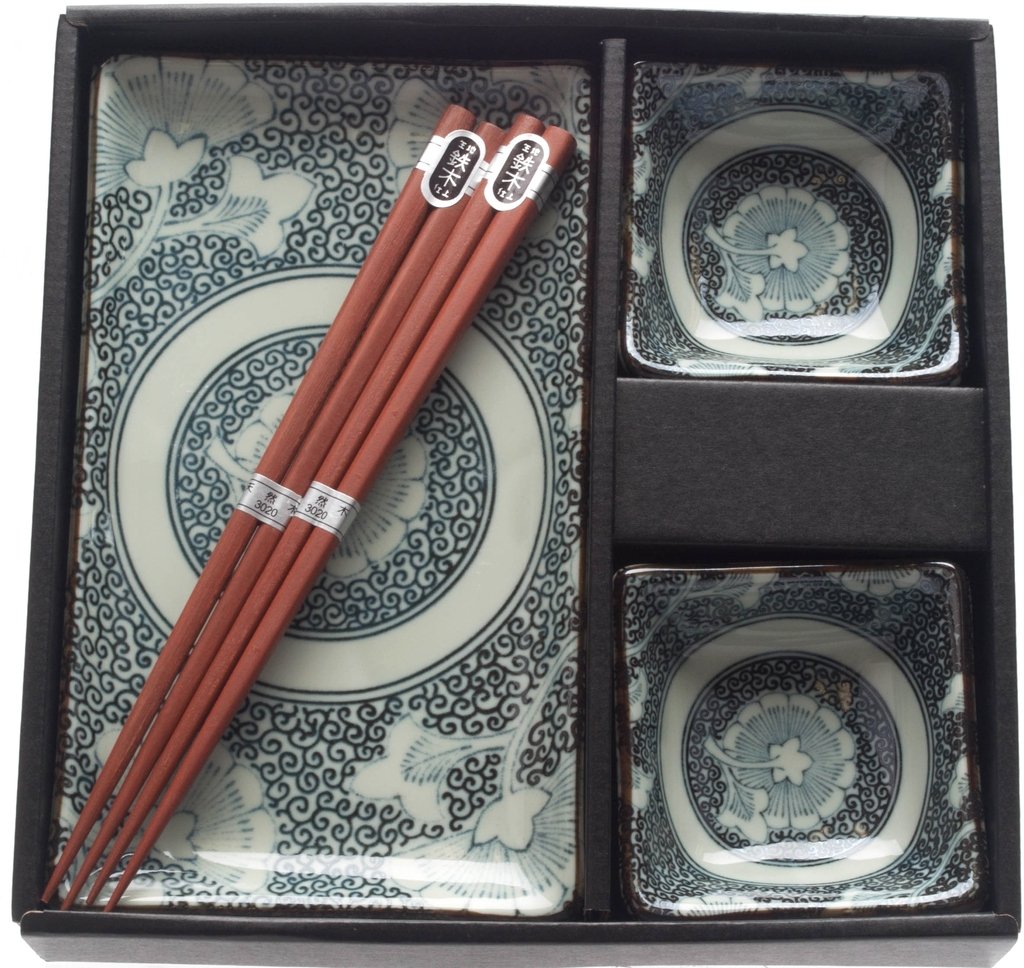 - This set has Two Plates 8 1/2 Inches by 5 Inches, Two 3 1/4 inch square sauce dishes and two 9 inch pairs of wooden chopsticks